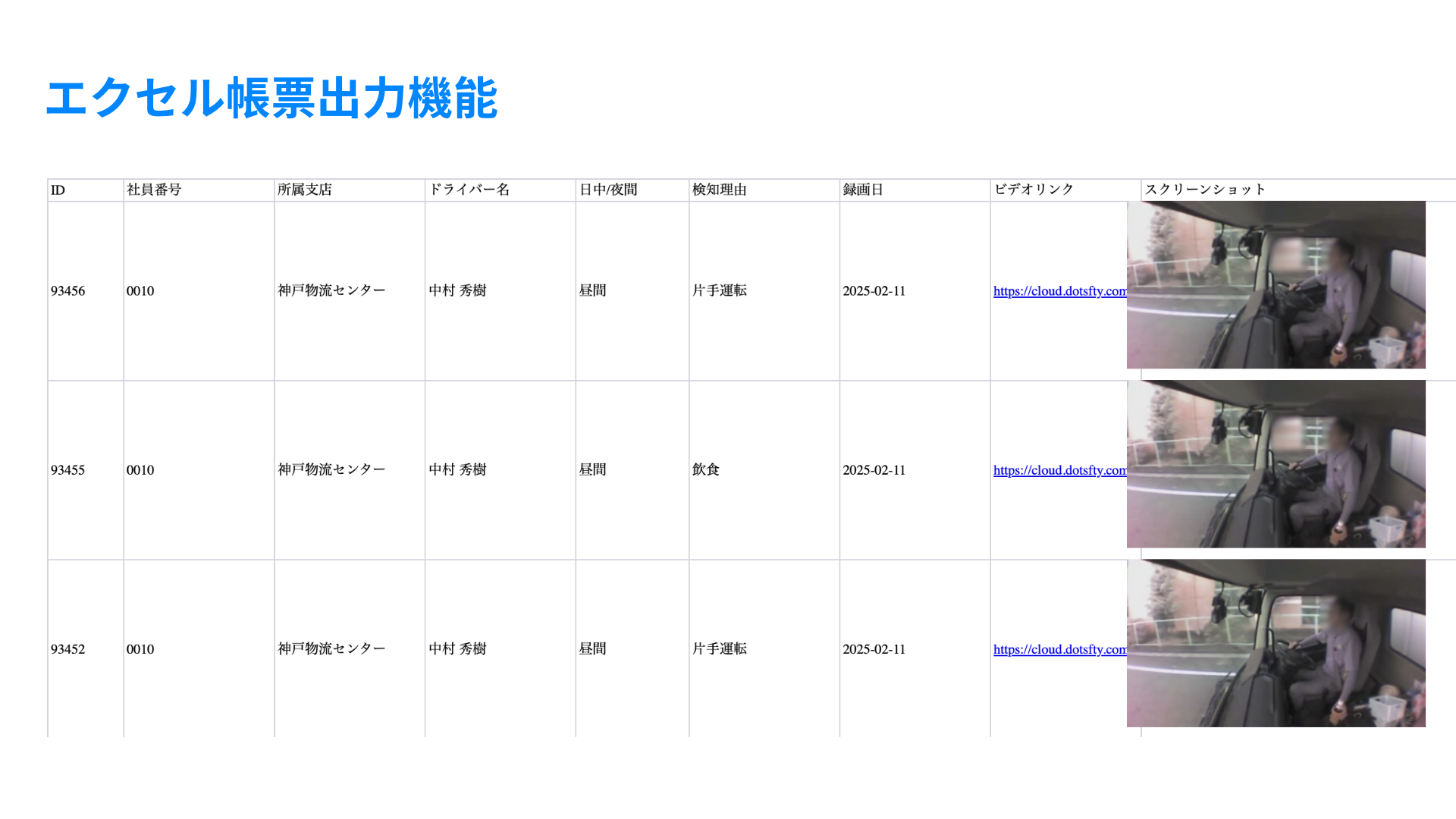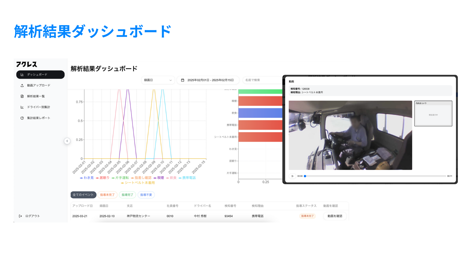 既設機器の活用により初期投資ゼロで導入でき、一時不停止・車間距離不足・ながら運転・シートベルト未装着・居眠りなど、事故につながる運転行動を高精度に検知。